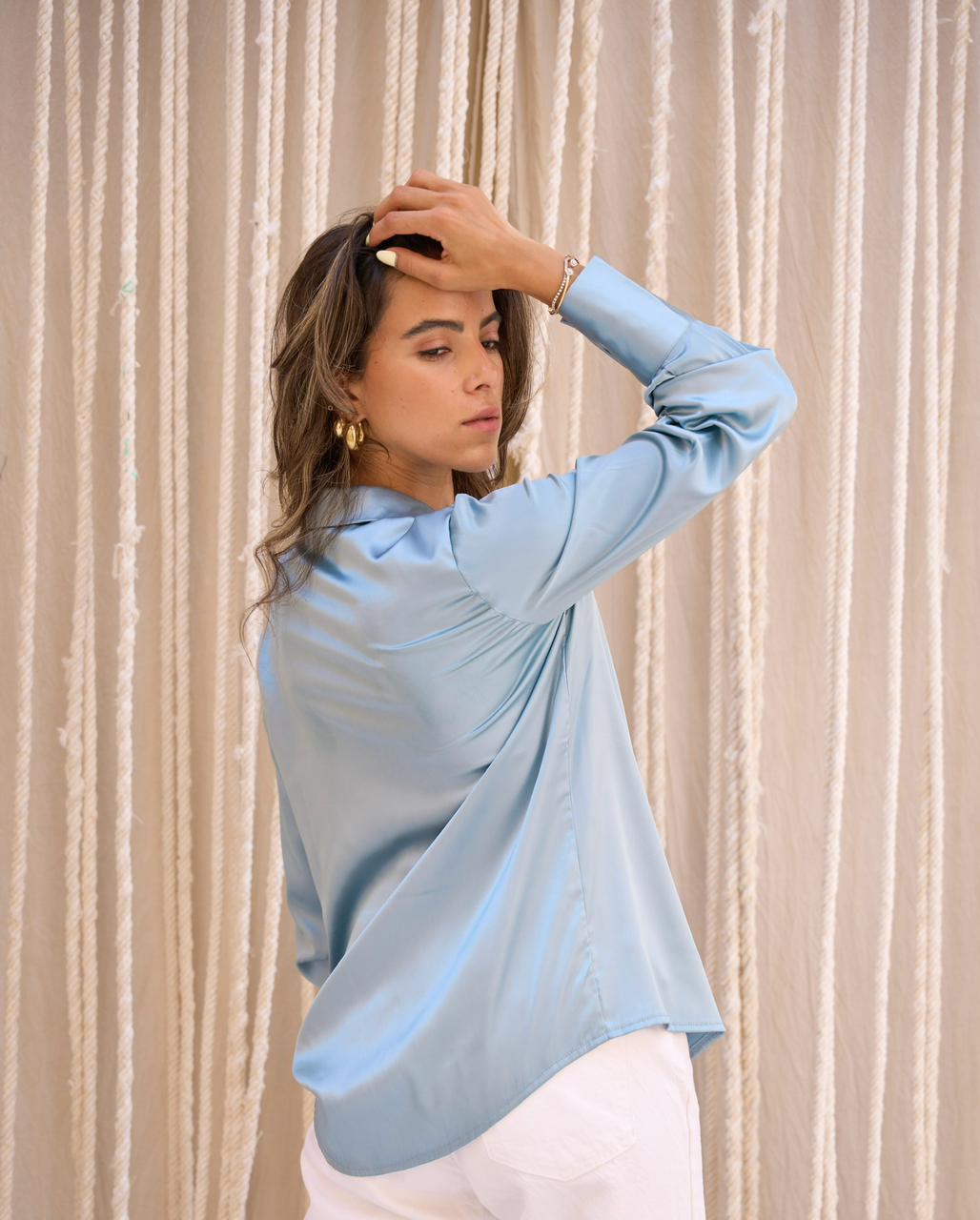 Flowy fabric. Satin fabric. Straight design. Classic collar. Long sleeve with buttoned cuffs